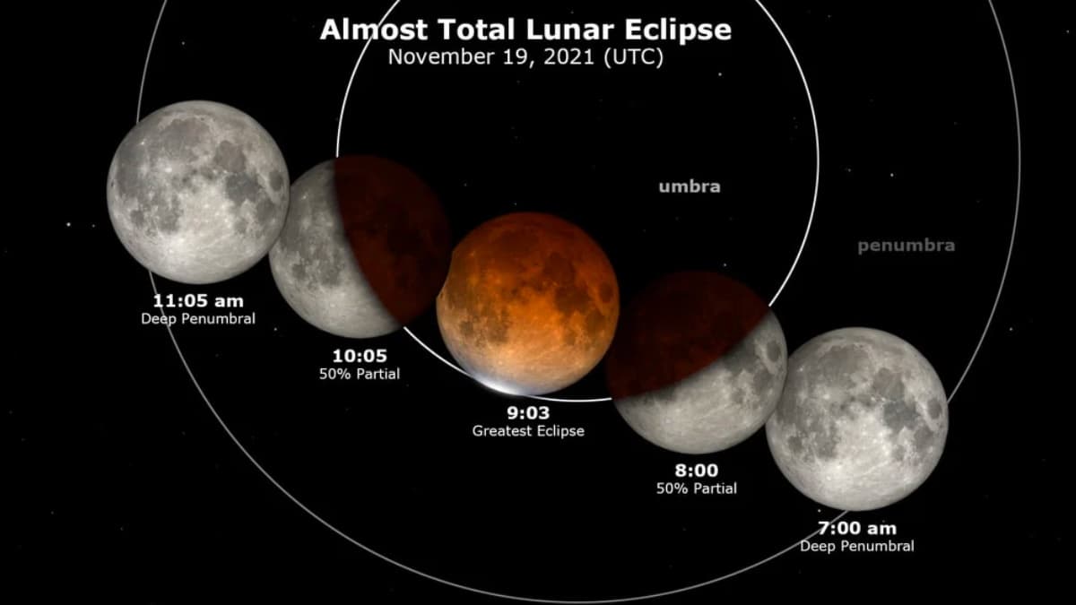 Todo o evento durará pouco mais de seis horas, e a Lua vai passar um eclipse lunar total de três horas, 28 minutos, e 24 segundos a passar pela parte mais escura da sombra da Terra (o seu umbra) – tornando-o no eclipse lunar parcial mais longo desde 1441, e de longe o mais longo deste século.